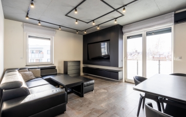 - nowoczesnego, w pełni wyposażonego salonu połączonego z kuchnią, jadalnią i wyjściem na duży balkon,