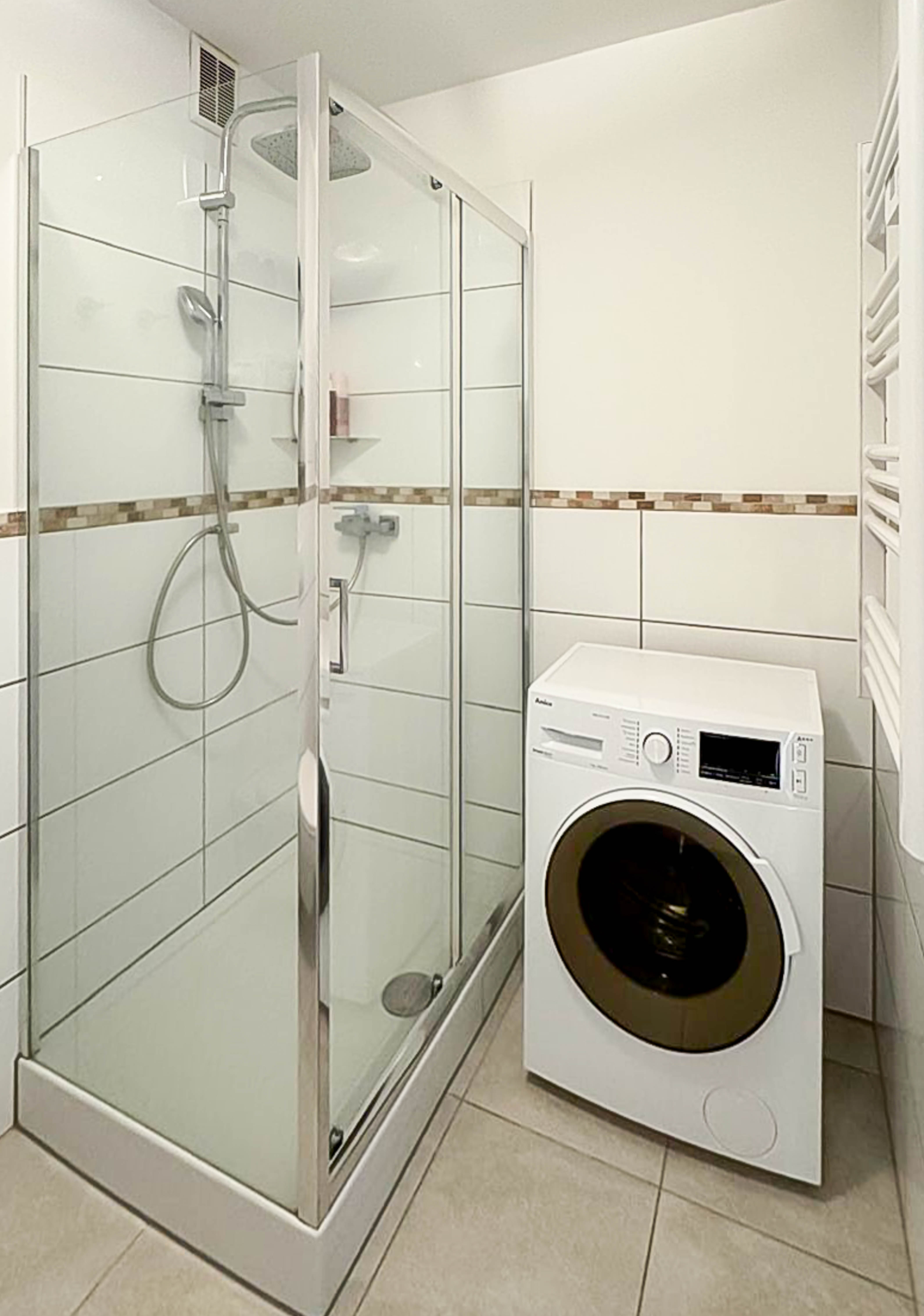 - łazienka z prysznicem i pralką,