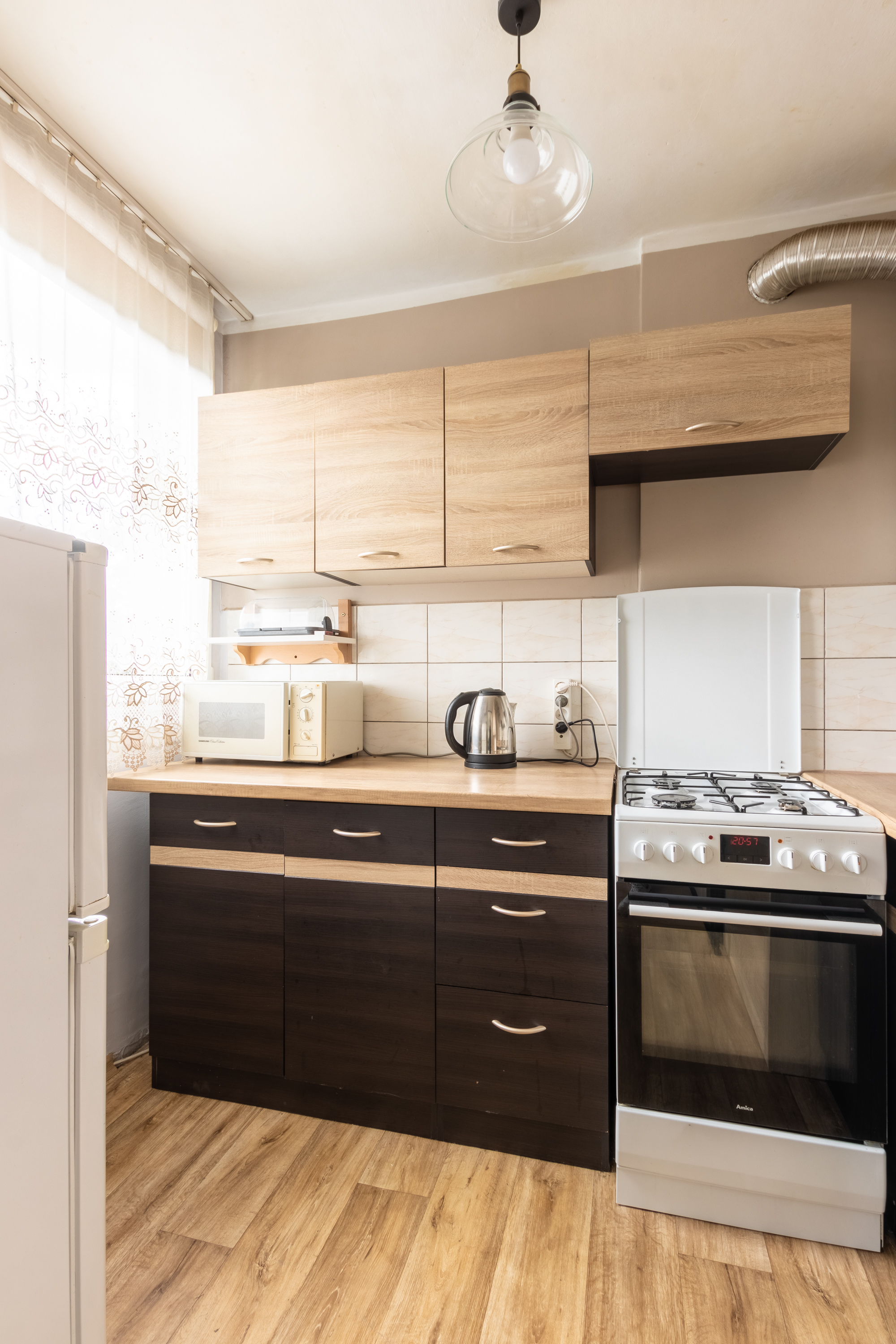 • Kuchnia – w pełni wyposażona: lodówka, mikrofalówka, kuchenka gazowa z piekarnikiem elektrycznym