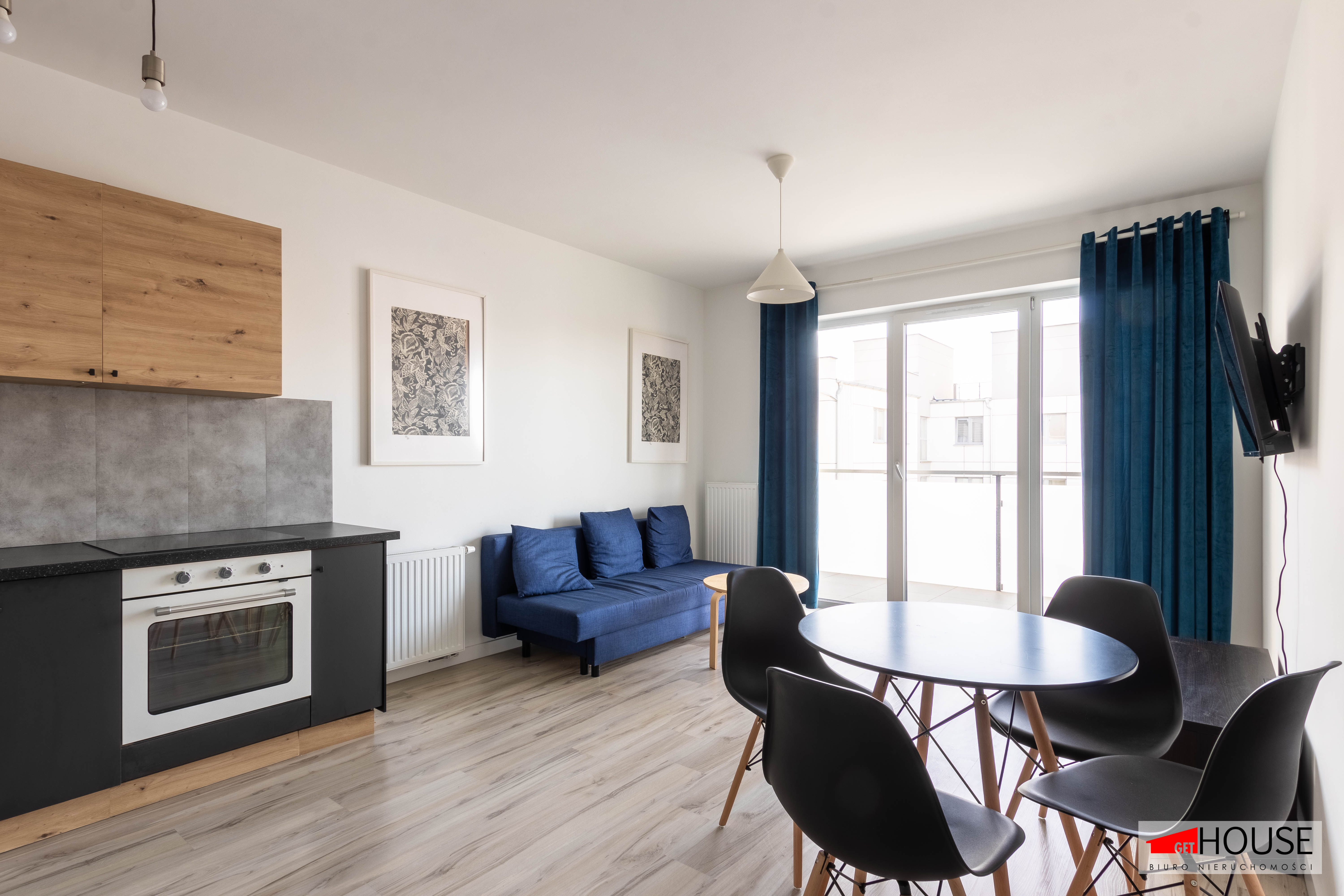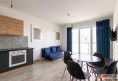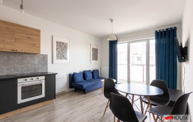 - nowoczesnego, w pełni wyposażonego salonu połączonego z kuchnią, jadalnią i wyjściem na duży balkon,