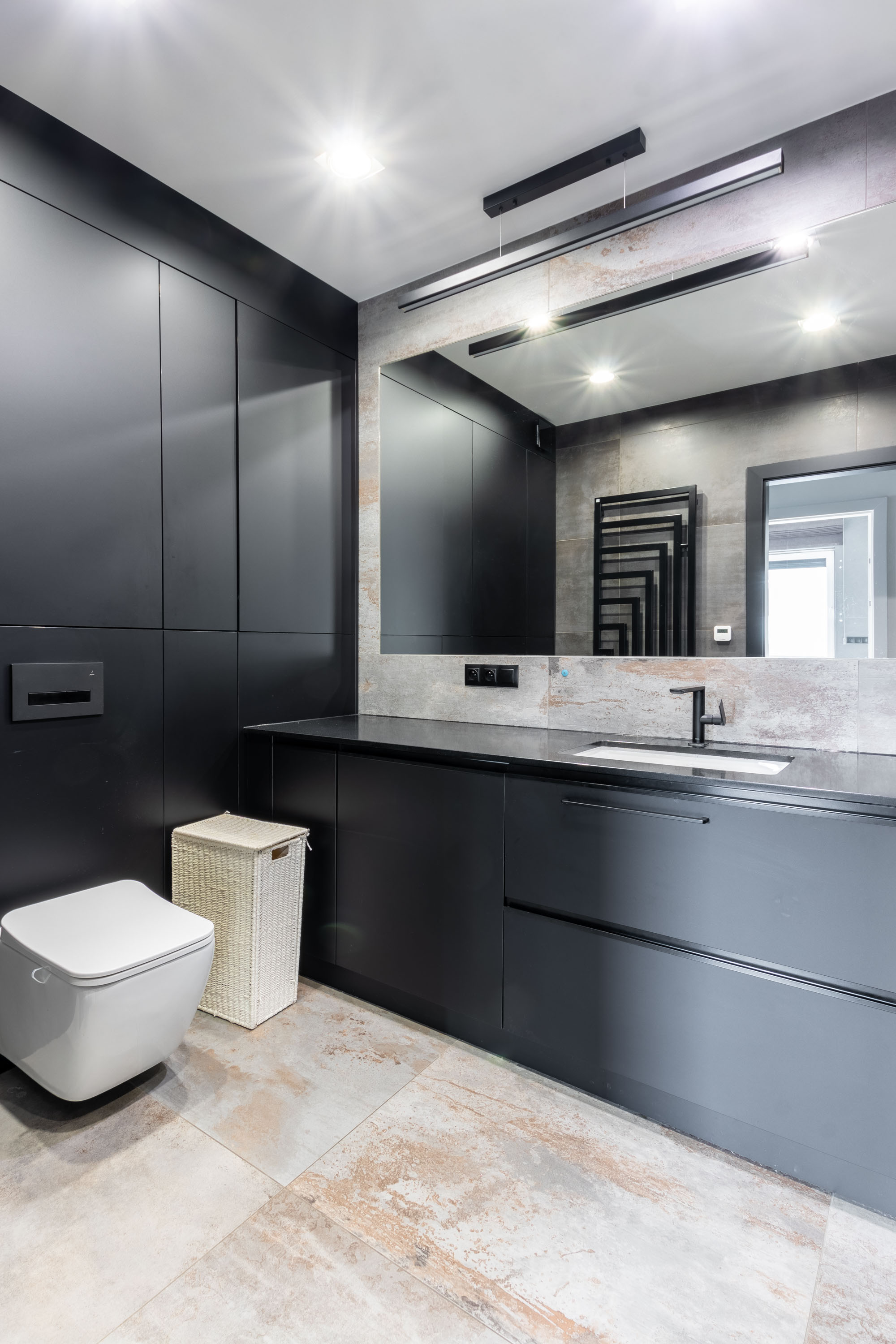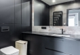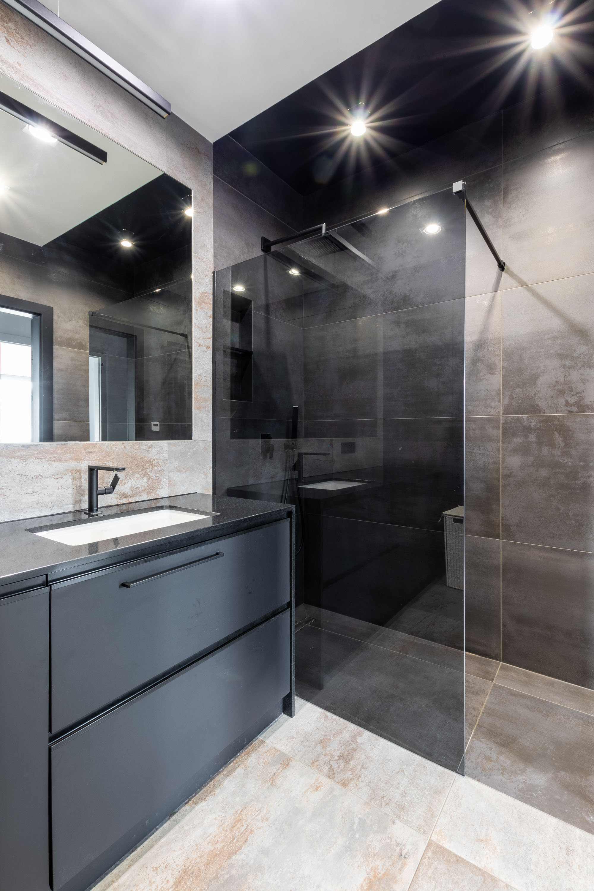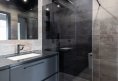 • łazienka z dużym prysznicem typu walk-in oraz zabudowaną pralko-suszarką,