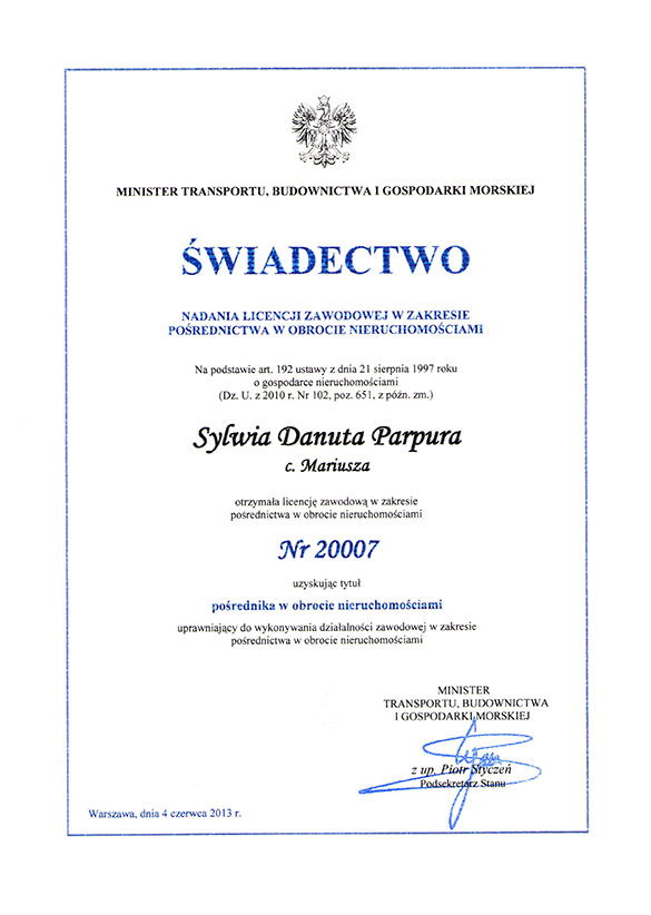 Świadectwo ukończenia studiów podyplomowych - POŚREDNIK W OBROCIE NIERUCHOMOŚCI